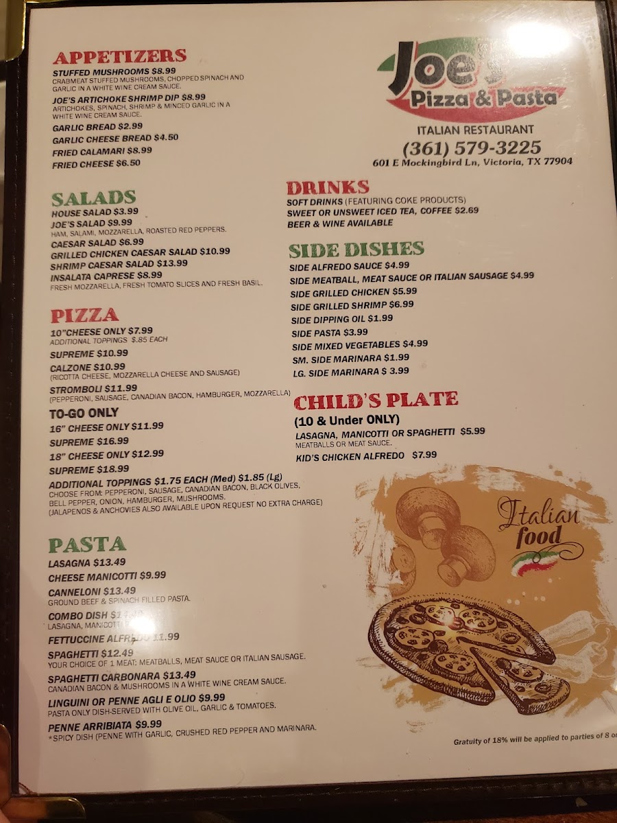 Welcome to Joe's Pizza & Pasta Victoria, a cherished Italian gem located at 601 E Mockingbird Ln, Victoria, TX. This establishment stands out for its commitment to authentic Italian cuisine, transforming local ingredients into delectable dishes that keep customers coming back.
